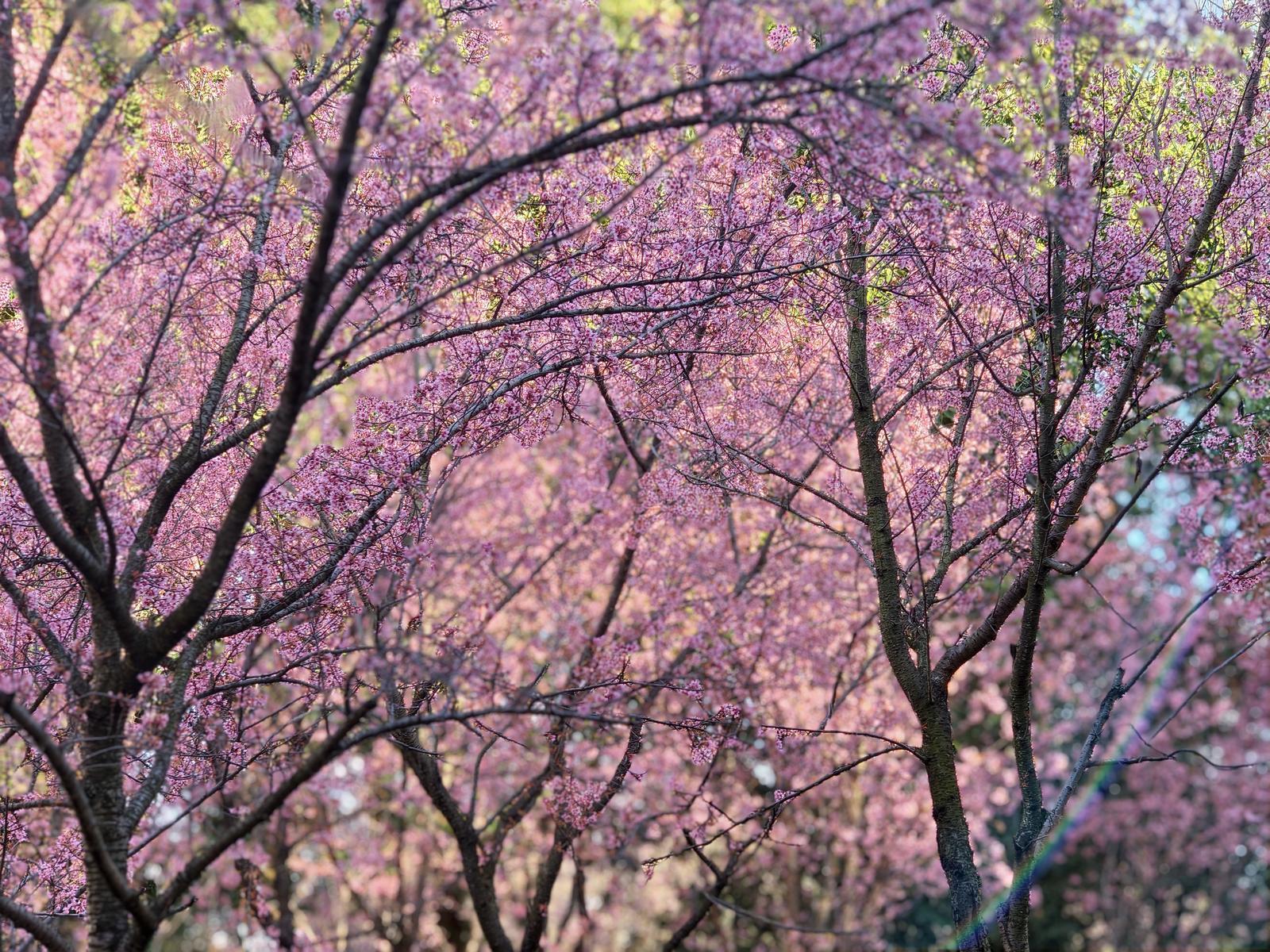 远远望去,粉绯花潮连绵起伏,宛若天边轻拢慢捻的云霞,温柔地铺展在天地间。花团密密匝匝地缀满枝丫,将隆冬晕染出几分柔媚春意。阳光穿枝拂叶,洒下斑驳光影。漫步花海,脚下是松软的落叶簌簌作响,身旁是烂漫花潮随风轻摇,耳畔是清脆鸟鸣婉转悠扬,共同交织成惬意安然的冬日盛景。