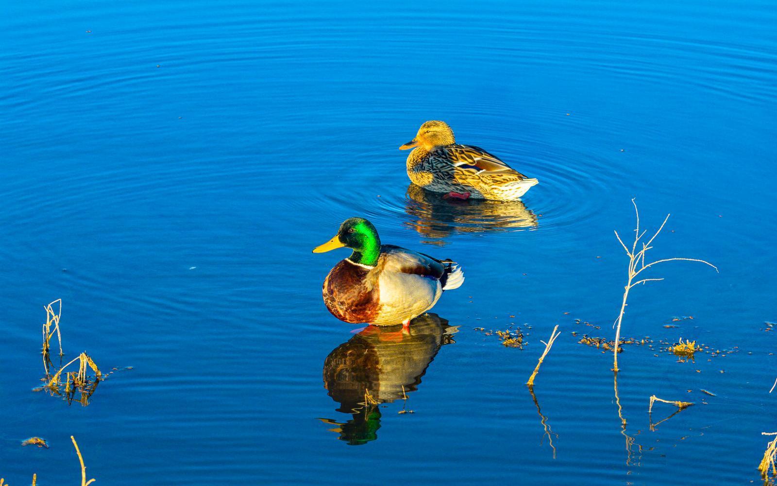 金色的芦苇与湛蓝的湖水交相辉映