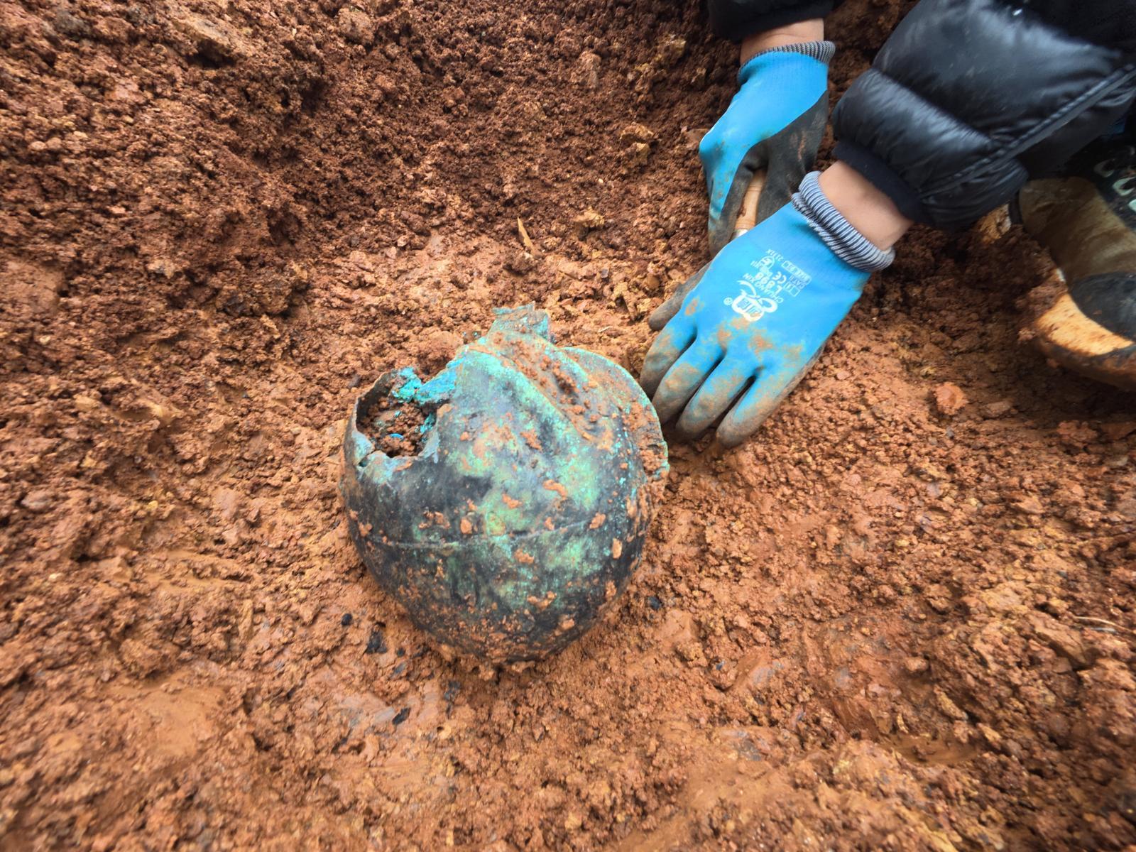 2024年4月,当地村民毕龙真在耕地挖掘蓄水池时,意外发现两件青铜残片。经鉴定,这两件器物分别为直径约35厘米的錞于和直径约40厘米的铜釜(斧)残片,属距今2000年左右的战国至汉代时期,应为墓葬出土随葬品。弥勒市文物管理所所长杨德辉表示,此类器物在弥勒地区属首次发现。