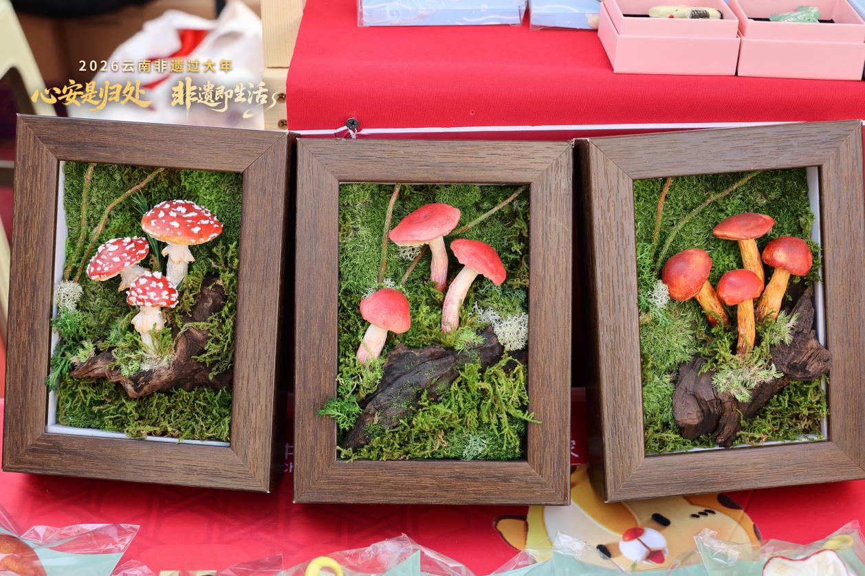 在“乡愁旅居大观园”,一个摆满红嘴鸥和野生菌文创的展位格外显眼。这些充满“云南味”的元素通过面塑这一非遗技艺,被制作成了极具代表性的文创产品。面塑手艺人于晓玲介绍,创作红嘴鸥和野生菌两个系列产品的初衷是将非遗技艺与地域IP、生态文明相结合,做成有地域特色的文创产品,让游客看得见、摸得着、带得走。