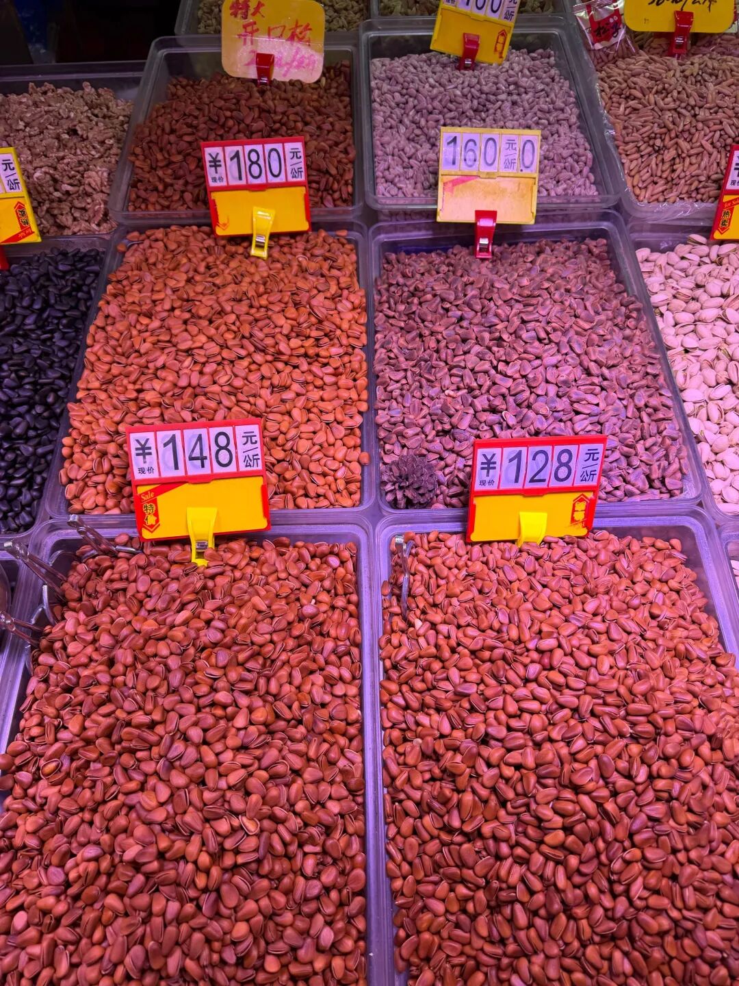 在金马正昌水果批发市场,也有多家售卖炒货的门店。“开心果100元/公斤、紫皮腰果70元/公斤、巴旦木65元/公斤。”商户姚女士介绍,普通炒货价格变化不大,但开心果、开心松子每公斤的进价比往年贵了10元,每公斤零售价也上调了10元。