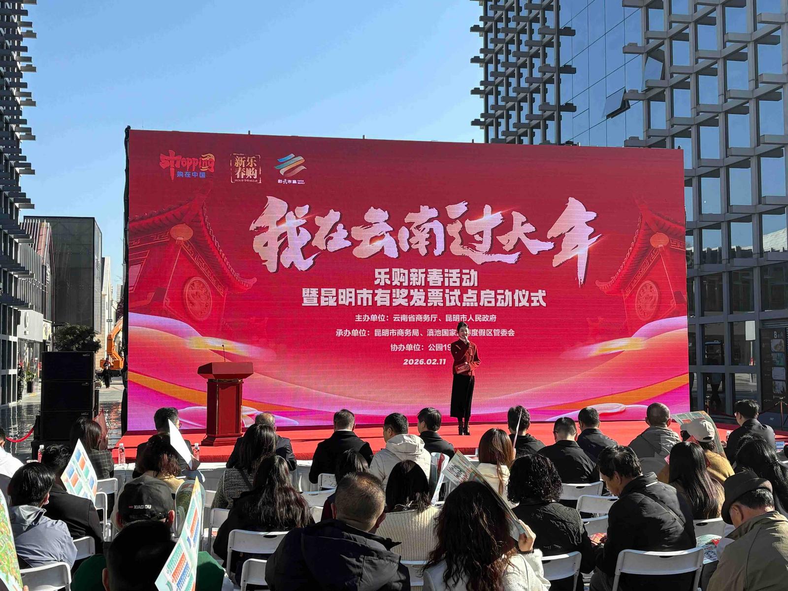 2月11日,由云南省商务厅、昆明市人民政府联合主办的“我在云南过大年”乐购新春活动暨昆明市有奖发票试点启动仪式在公园1903举办。