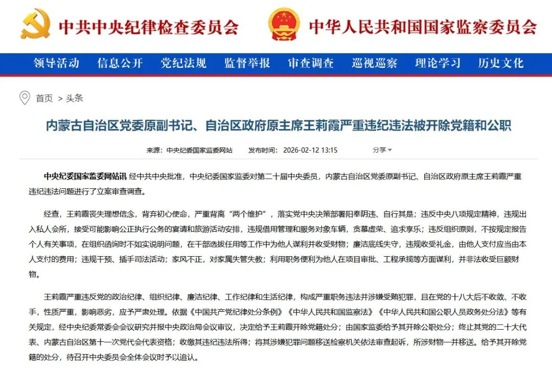 经中共中央批准,中央纪委国家监委对第二十届中央委员,内蒙古自治区党委原副书记、自治区政府原主席王莉霞严重违纪违法问题进行了立案审查调查。