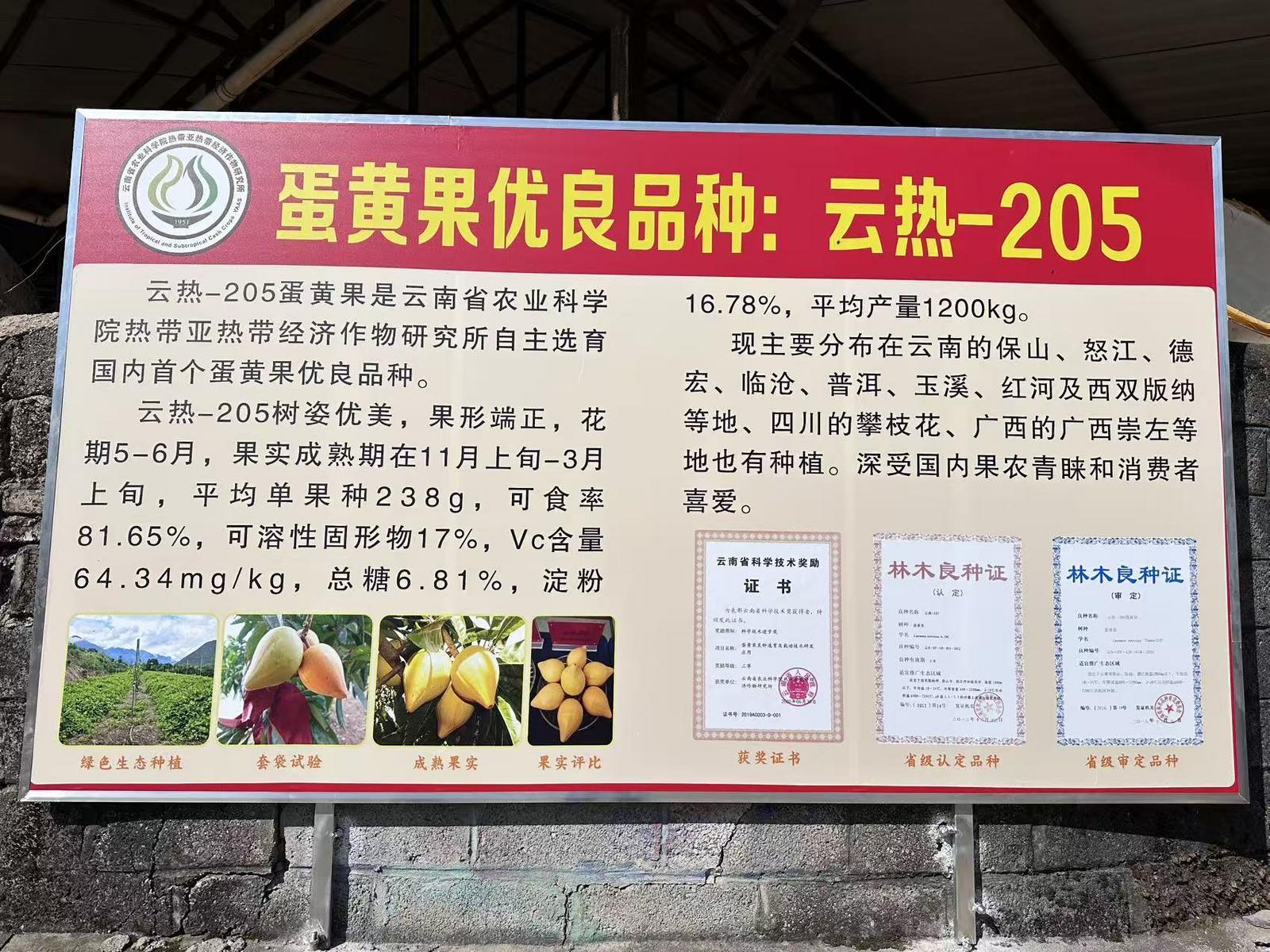 据介绍,“云热-205”是国内自主选育的首个蛋黄果优良品种,它树姿优美,果形端正,花期5—6月,果实成熟期在11月上旬至3月上旬。现主要种植于云南保山、怒江、德宏、临沧、普洱、玉溪、红河及西双版纳等地,四川攀枝花、广西崇左等地也有种植,深受果农和消费者喜爱。