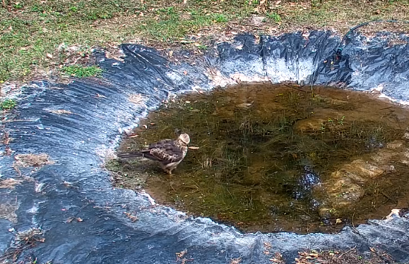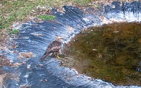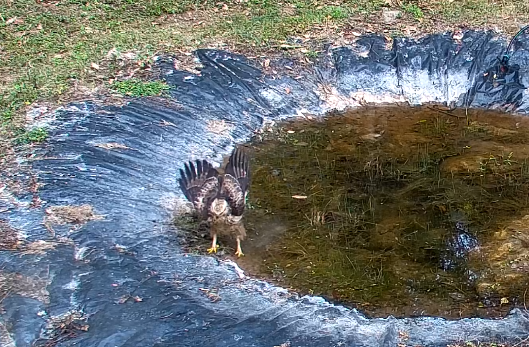 画面中,一只体型健硕、头顶羽冠的鹰雕在保护区的饮水点饮水。这只鹰雕展现出了高度的警觉性,多次抬头环顾四周,确认环境安全后方低头饮水,随后振翅离去,行为自然流畅。