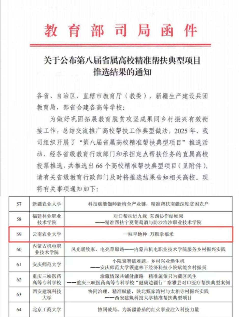 近日,教育部公布第八届省属高校精准帮扶典型项目推选结果。云南农业大学申报的《一粒旱地种 万颗幸福米》在200余个项目中脱颖而出,成为66个典型项目之一。这充分体现了该校在巩固拓展脱贫攻坚成果,衔接乡村振兴的工作成效。