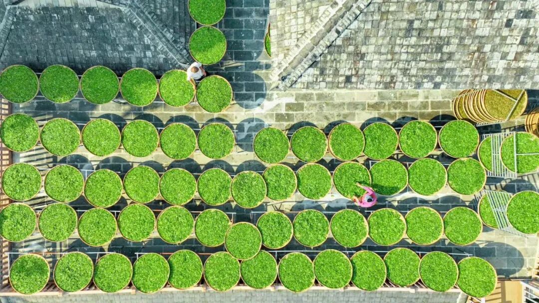 眼下正值春茶采收季,在世界遗产地景迈山,一幅独特的晾晒图景引人注目:青瓦屋顶上,竹编簸箕铺满茶叶,在蓝天与山风间静享“日光浴”。