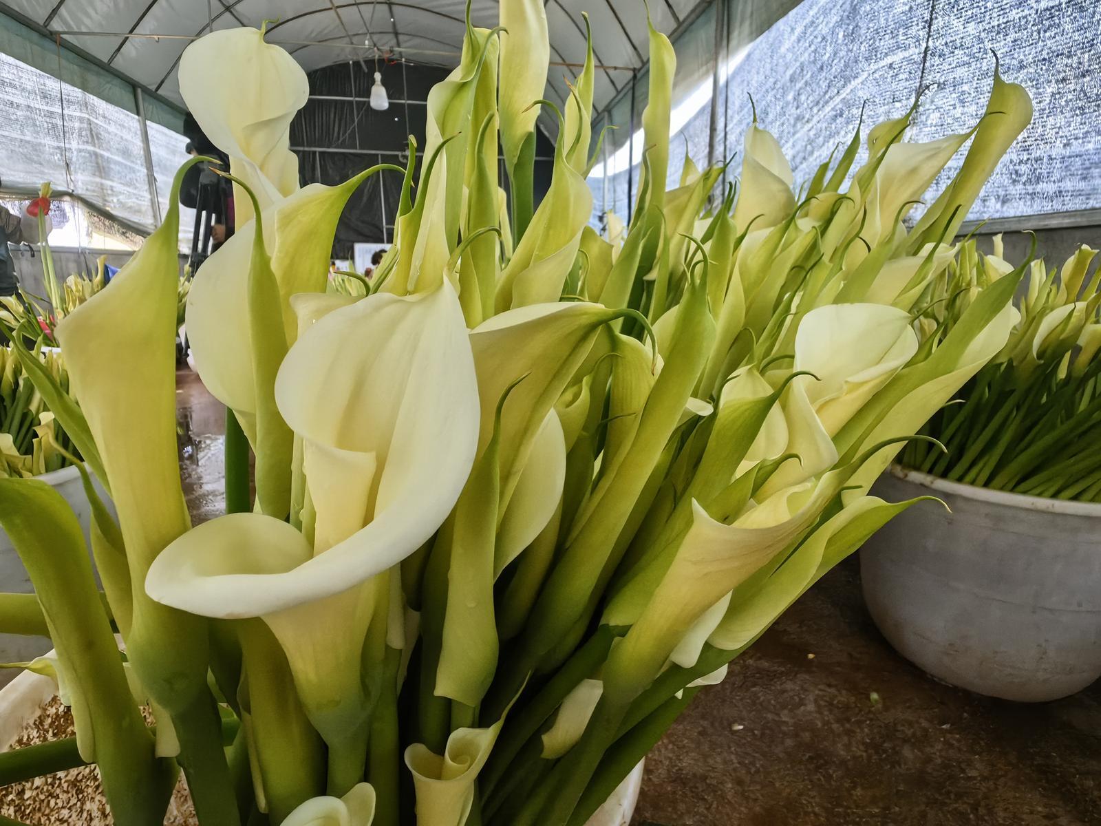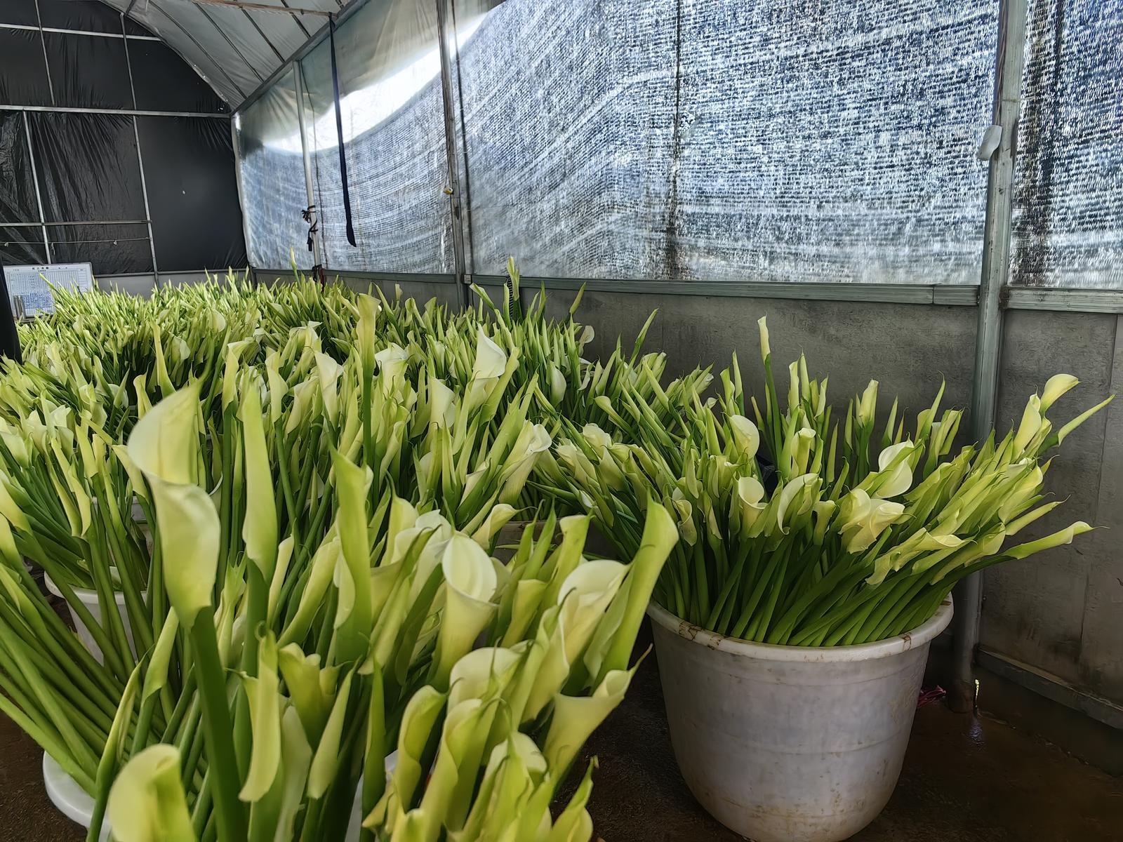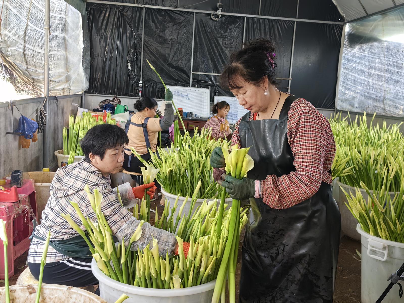 基地负责人陈五云介绍,基地自2016年开始栽种马蹄莲,从最初的几亩试种,逐步扩大到如今的60亩,品类也从单一的白色拓展至粉、黄等多色系。马蹄莲花期较长,每年9月进入盛花期,可持续采摘至次年6月,其中每年2月至3月为盛花期高峰,眼下基地每天可采摘马蹄莲超1万把,产品供不应求,产销两旺势头强劲。