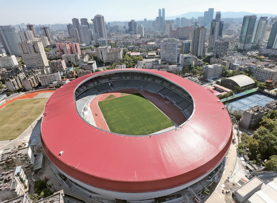 3月27日,拓东体育场环形场顶已铺设完毕,白墙与红顶在昆明的蓝天下格外引人注目。完工后,整个场馆将拥有4万多个座位、26个疏散通道,能够满足专业体育赛事、全民健身和文娱活动需求。值得一提的是,座椅将采用蓝花楹配色,北通道两侧新种植了32株蓝花楹,彰显昆明城市特色。