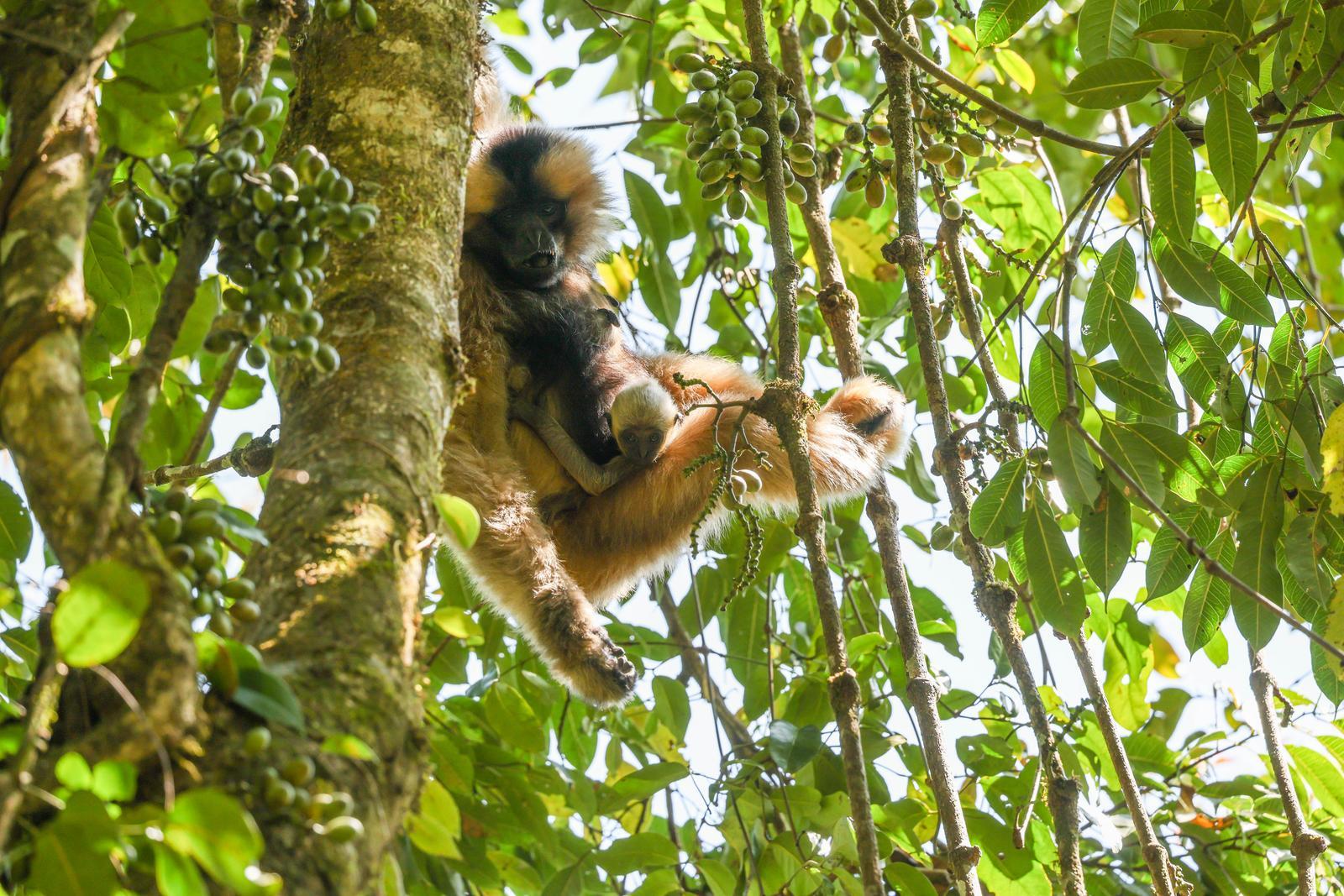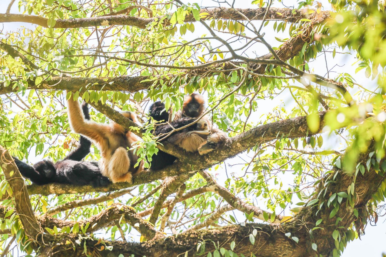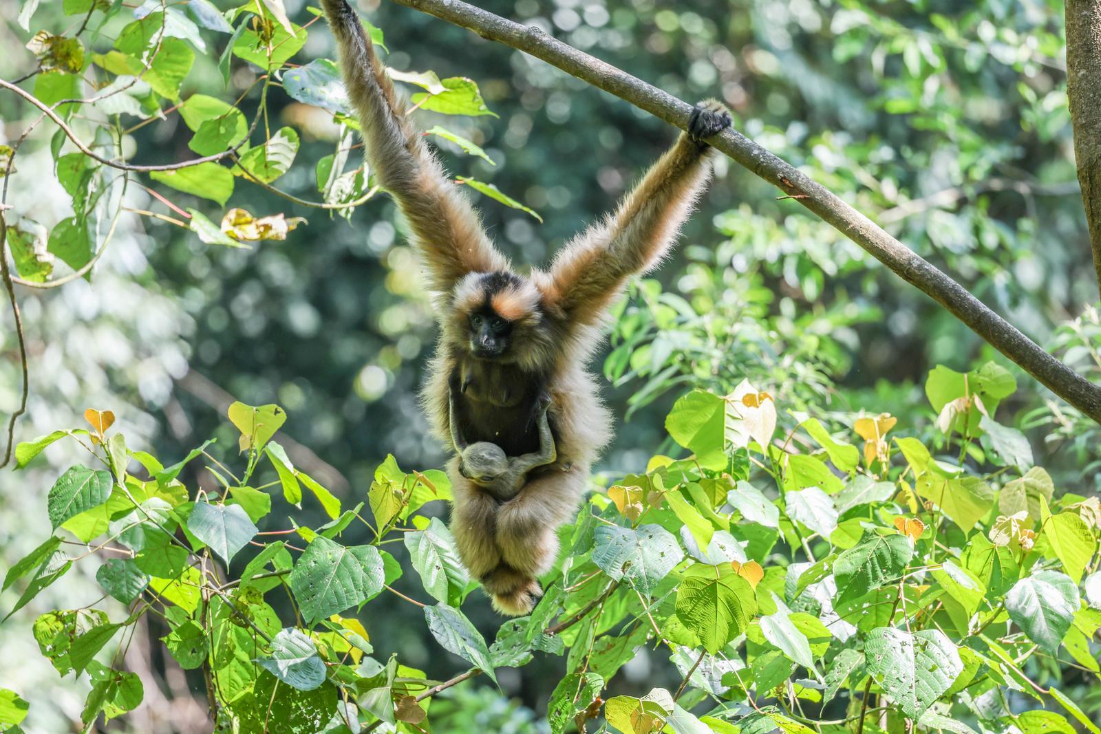 连日来,工作人员持续跟踪监测,记录下了珍贵画面。监测资料显示,长臂猿妈妈在树冠间灵活移动,采食嫩叶、花果,一只乳白色的猿宝宝被稳稳抱在怀中,不时吮吸乳汁。在附近,猿爸爸和猴群中另一成员静静守护。饱餐后的猿宝宝时常探出脑袋,睁大眼睛好奇地观察周围环境,母子状态均十分良好。
