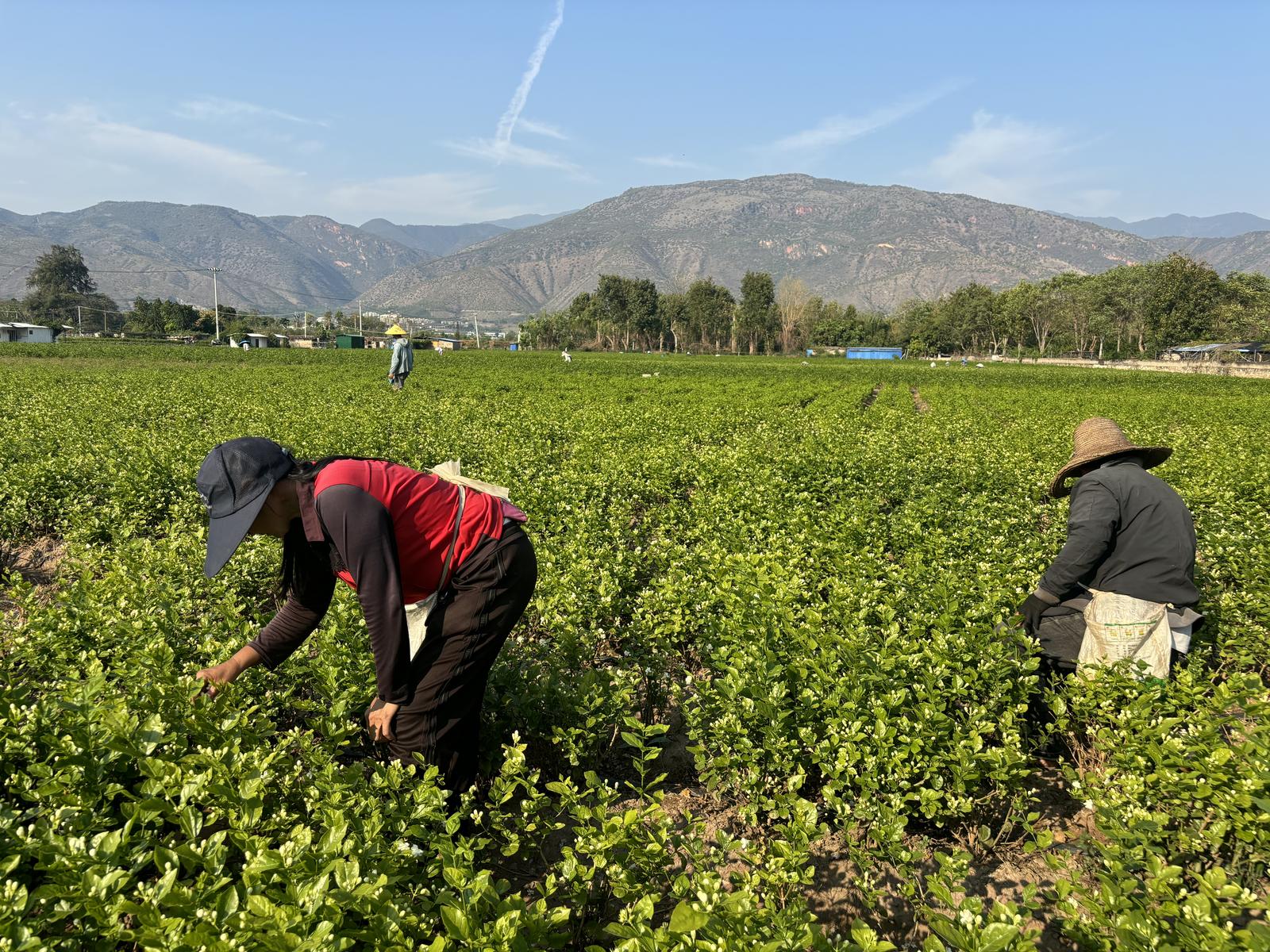 在元江县澧江街道的一片茉莉花种植区,洁白的花苞星星点点散落在绿叶间,花农们分散在连片的花地里,双手灵巧快速地翻采着花苞。得益于持续的晴好天气,今年元江县的茉莉花上市早,质量和产量较往年都有了不错的提升,收购价也相对稳定,给花农们带来了可观的收入。