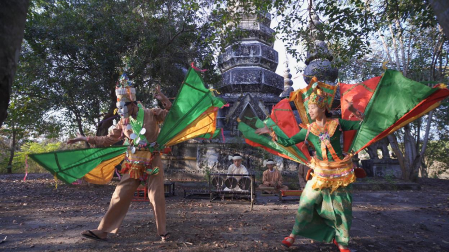 流传于孟定镇的紧那罗舞以傣拳为基础,采用雌雄共舞的形式表演,以雄鸟的舞蹈语汇见长。神鸟头部灵活,舞步轻盈欢快,动作刚劲有力,给人以雄赳赳之感,把活泼可爱的神鸟表现得活灵活现、韵律十足。傣族紧那罗舞于2022年12月被公布为第五批省级非遗代表性项目。