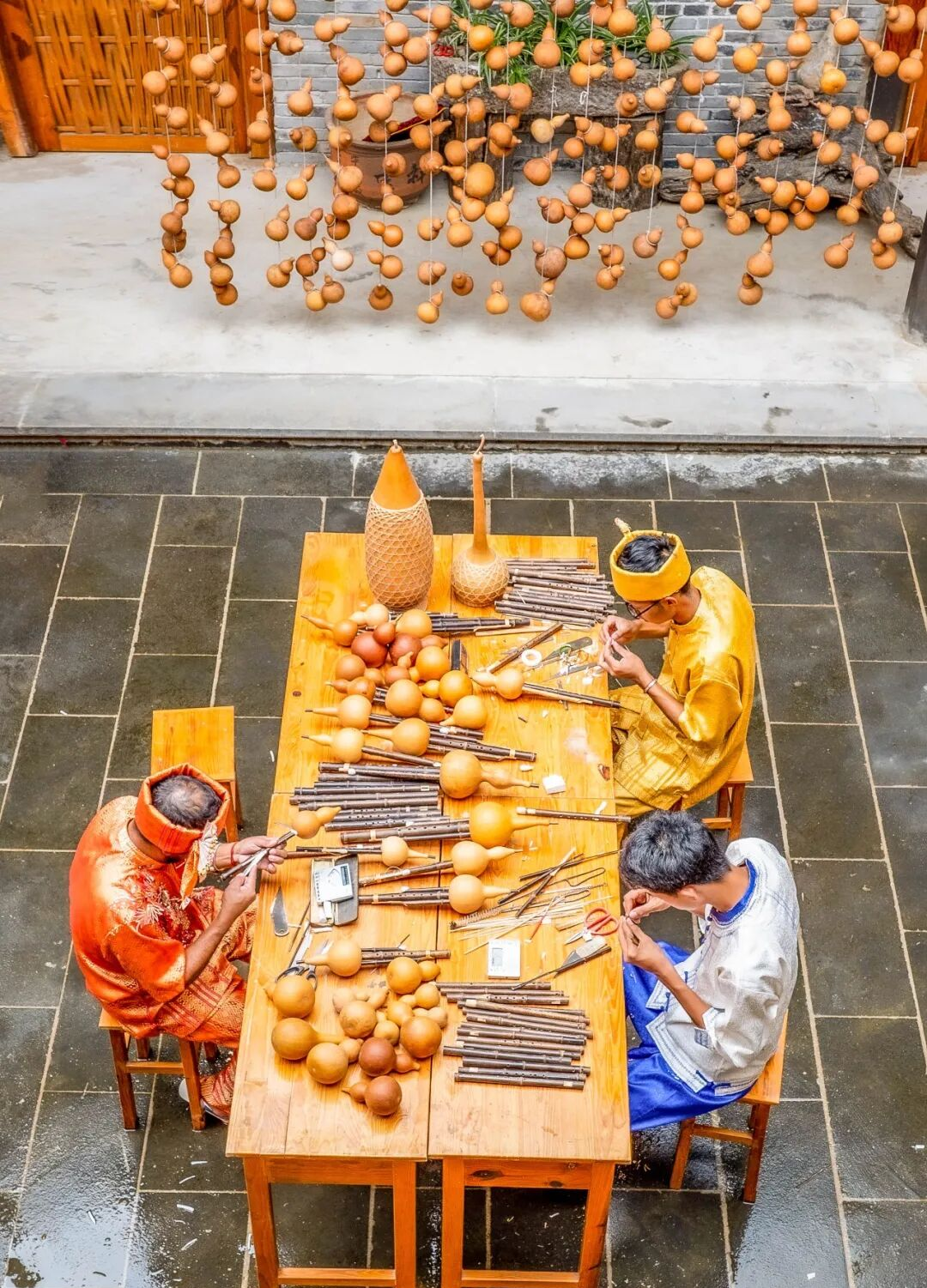 步入哏从国葫芦丝工作室,便能看到屋檐上挂着一排排奇形怪状的葫芦,屋内的竹篱笆还为故居增添了几许古朴的韵味。在这里雅居小坐,观葫芦丝制作工艺、演奏,感受深厚的葫芦丝历史文化底蕴。