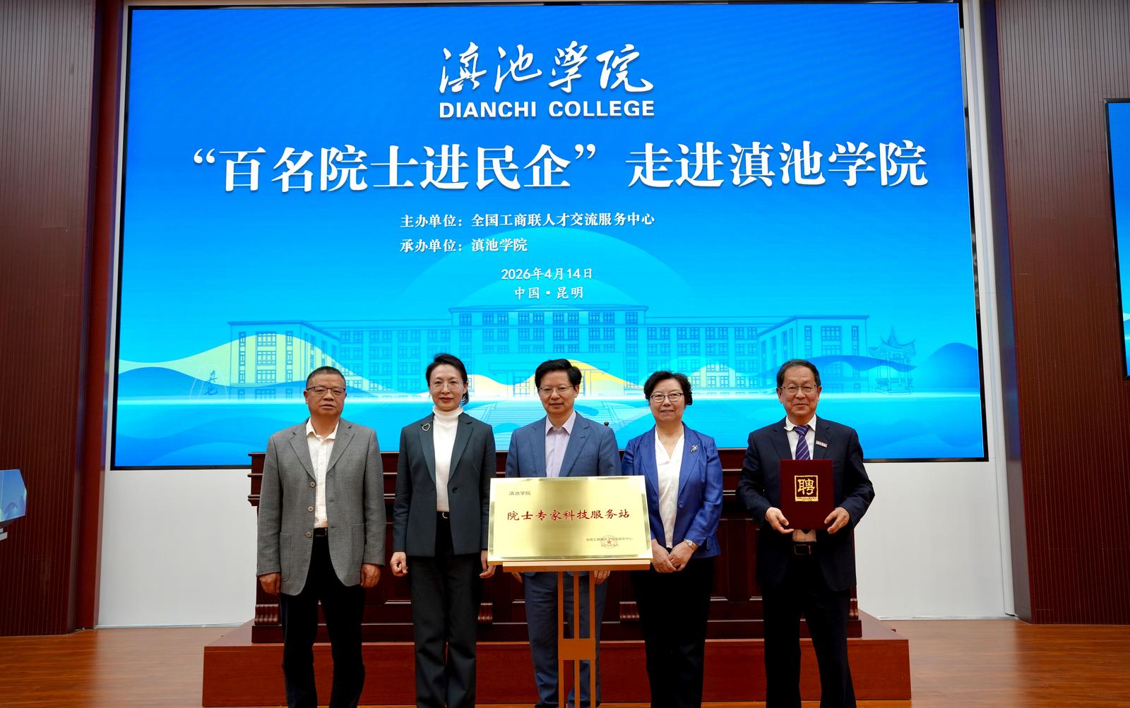 活动最后,全国工商联人才中心副主任高波、滇池学院校长甘雪春共同上台,为滇池学院“院士专家科技服务站”揭牌并颁发站长聘书。