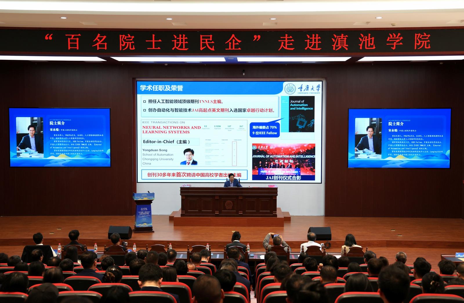 宋永端是自动化与人工智能领域的国际知名专家,在非线性控制等前沿方向取得多项突破性成果。专题报告环节,宋永端以《人工智能底层逻辑及发展趋势》为题,给与会嘉宾、师生带来目前人工智能、自动化行业内最前沿的发展方向、赋能产业的解读。今后将与滇池学院在学科建设、人才培养、科学研究等方面做深入交流探讨,寻找双方合作的共同点,促进学校的学科发展和人才培养水平。