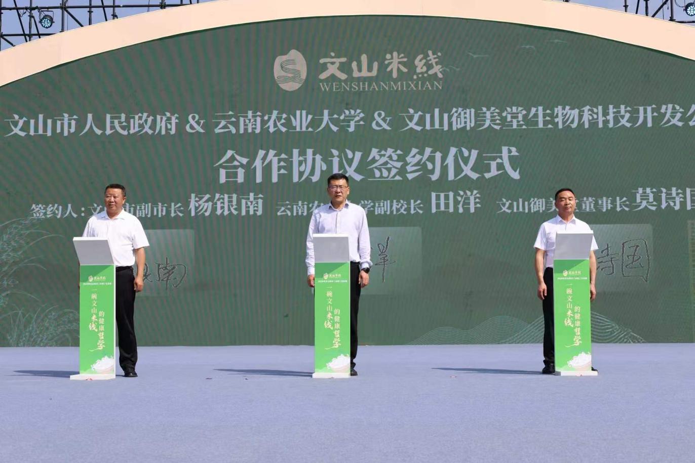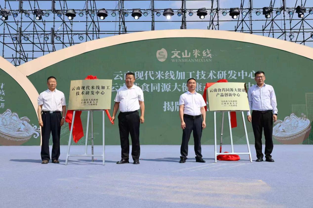 4月28日上午,2026年文山早点(米线)文化周正式开幕。云南农业大学副校长田洋代表学校,与文山市人民政府、文山御美堂生物技术开发公司正式签订三方合作协议,同步为“云南现代米线加工技术研发中心”和“云南食药同源大健康产品创新中心”揭牌,搭建起高校、政府与企业协同联动的产业研发平台。